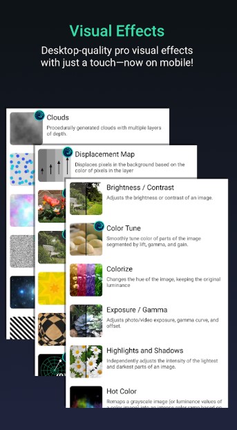Effects in the animation video gives a next level look to your video, So AM Pro Mod APK offers you inbuilt Visual Effects to use in the motion graphic vidoes. There are a 1000s of Visual effects available in store like Hot color, exposer, colour tune, highlights and shadows, clouds, etc and much more. You can easily use these video effects in your animation. This gives your animation video and great look. Tune color can help you to tune the video animation color. You can also control the exposer in the video by applying these all visual effects.