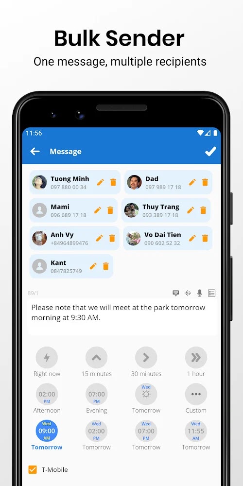 Schedule your time to send messages automatically. This feature is very useful for forgetful or busy persons. Scheduled time can be exact or within a time range.