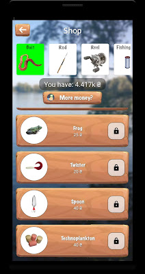 In the internal game store you can buy gear and bait for virtual money. During fishing, some gear may break, so it is possible to repair them.