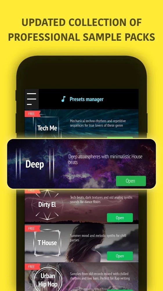 • Different sample packs (Trap,Shadow Hop,Big Room,Tech Me,T House ,Drill Trap, Dirty El, Deep and etc) with pro quality.It made by different sound producers specifically for dj mix pads
