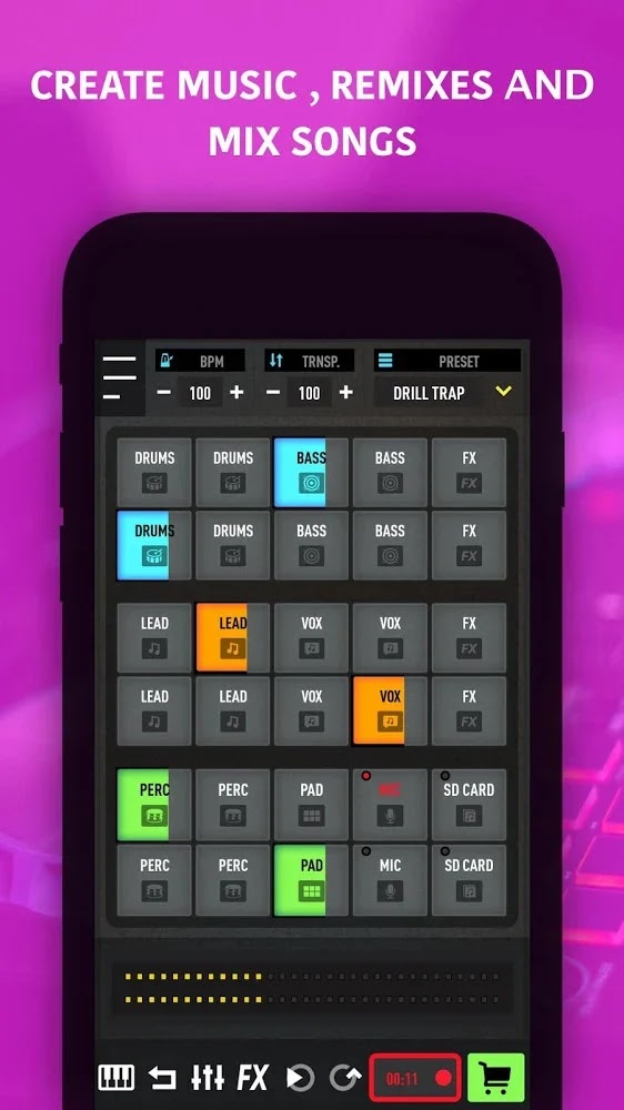 • 30 drum pads with original music loops .It consists of leads, bass, drums, voice, percussion and different audio effects