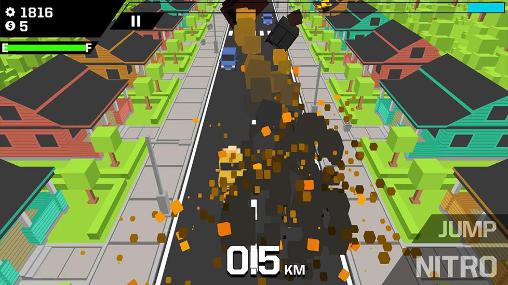 Nitro dash – break all the traffic rules there are. Speed through the streets hitting pedestrians and ramming cars. Do man tricks. The heroes of this game for Android can not only drive a car, but they can also jump from one car to another. Show your mad driving style. Accelerate the car and hit obstacles to destroy them, but remember that your car can also explode. Refuel, collect all the coins to unlock new characters and cars. Escape from police chasing you.
